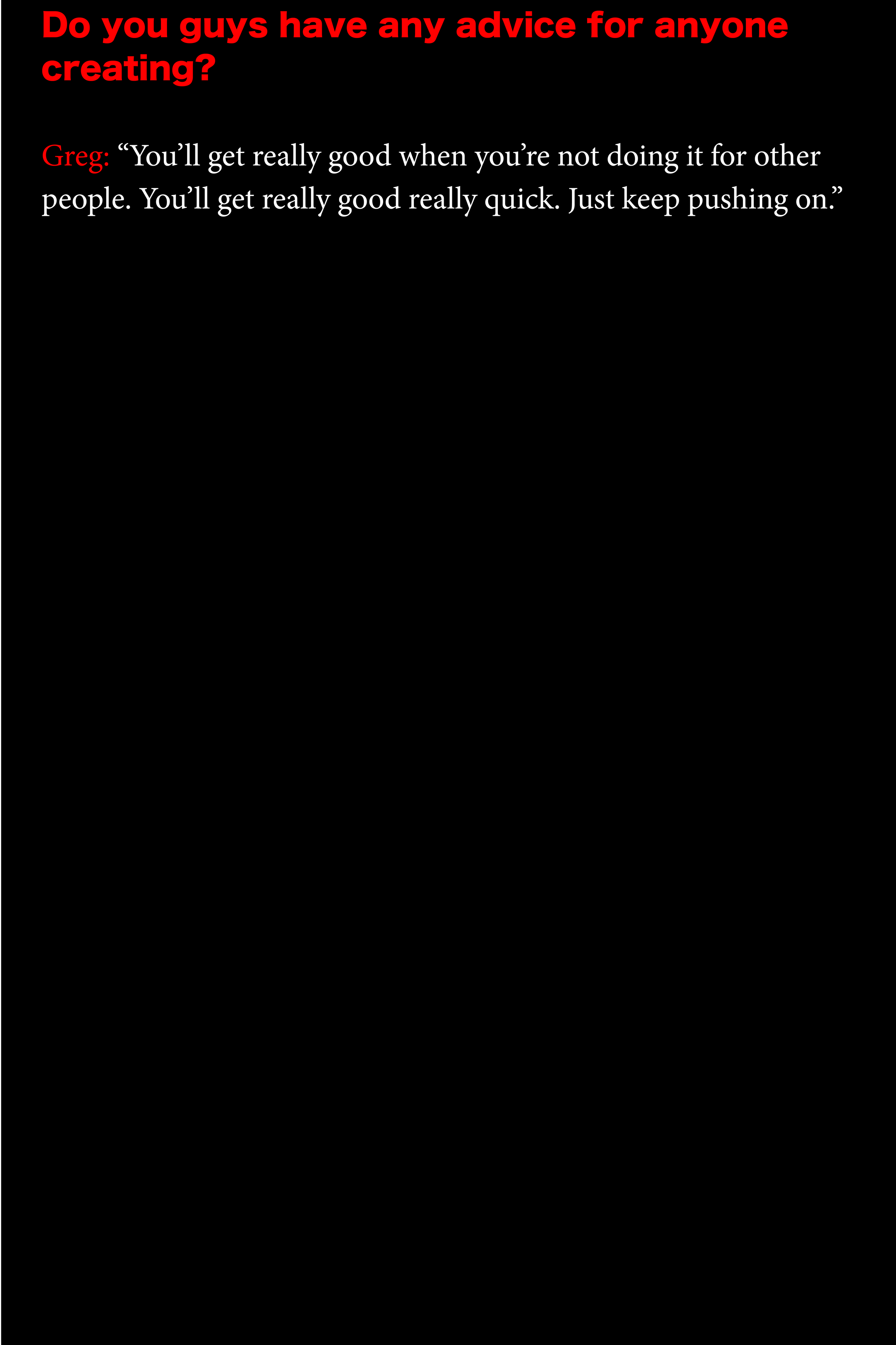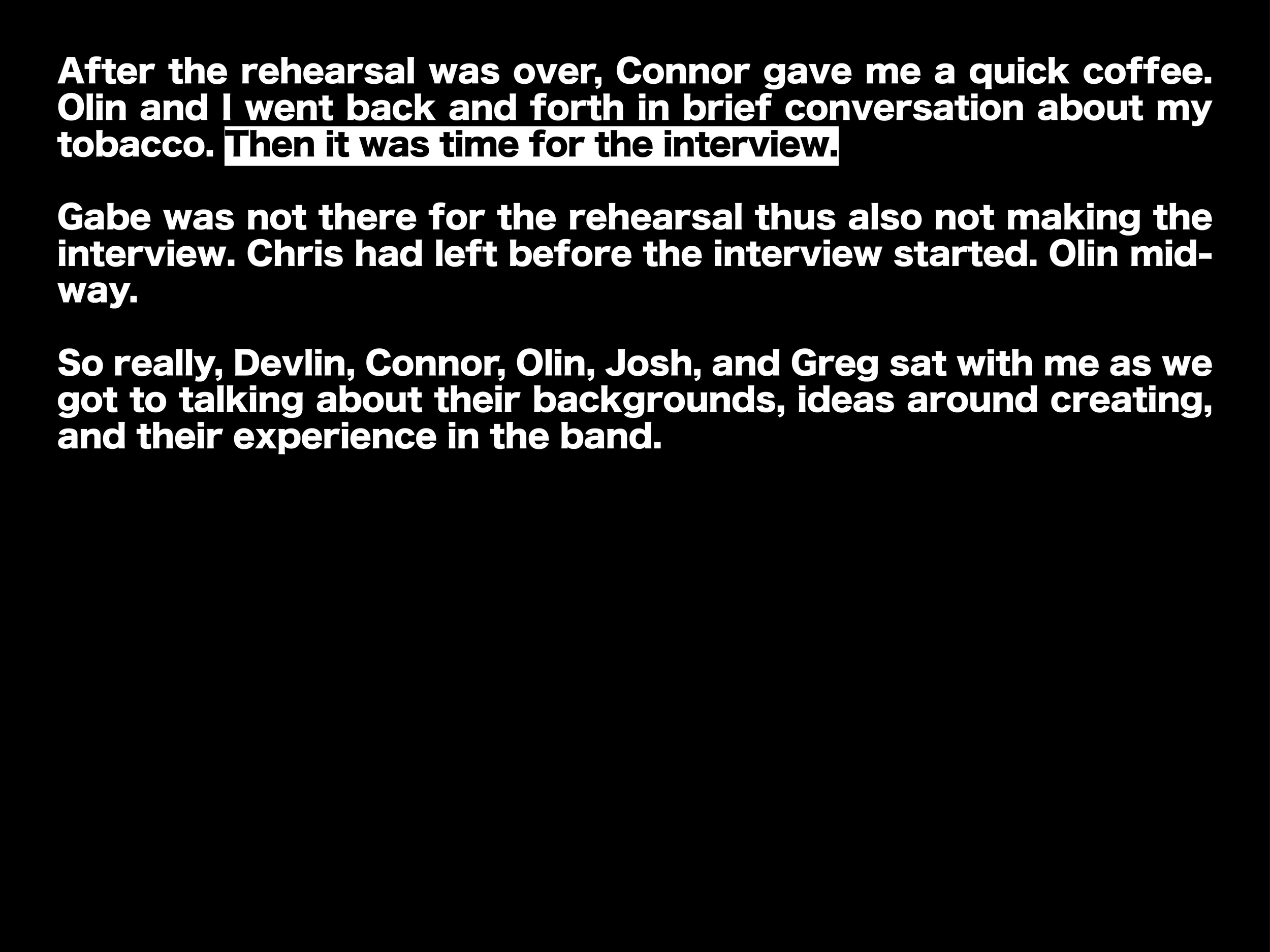 experience what I just walked in on. This was my first time meeting and seeing them. Once the song came to an end, Connor warmly thanked me for coming. I introduced myself to the guys and thanked them for having me.